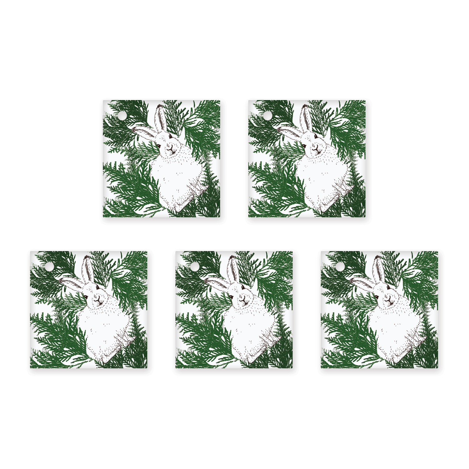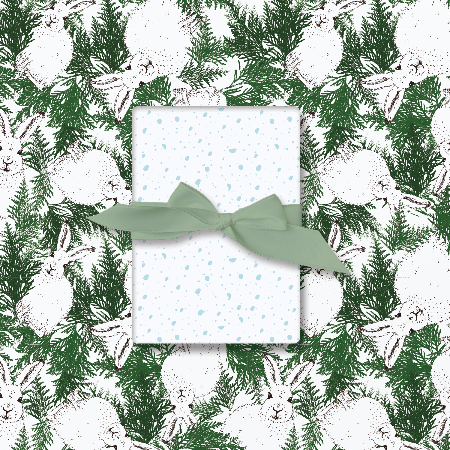 This luxury double-sided wrapping paper features arctic hares peering through deep green branches. The opposite side features a pattern of light blue snow falling on a white background.