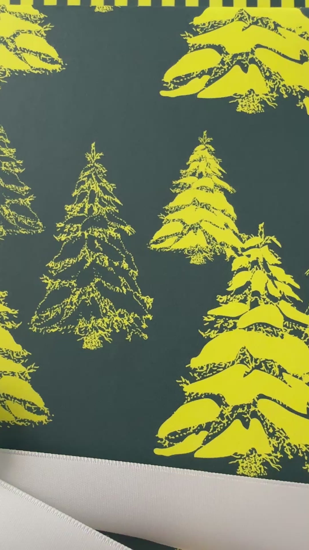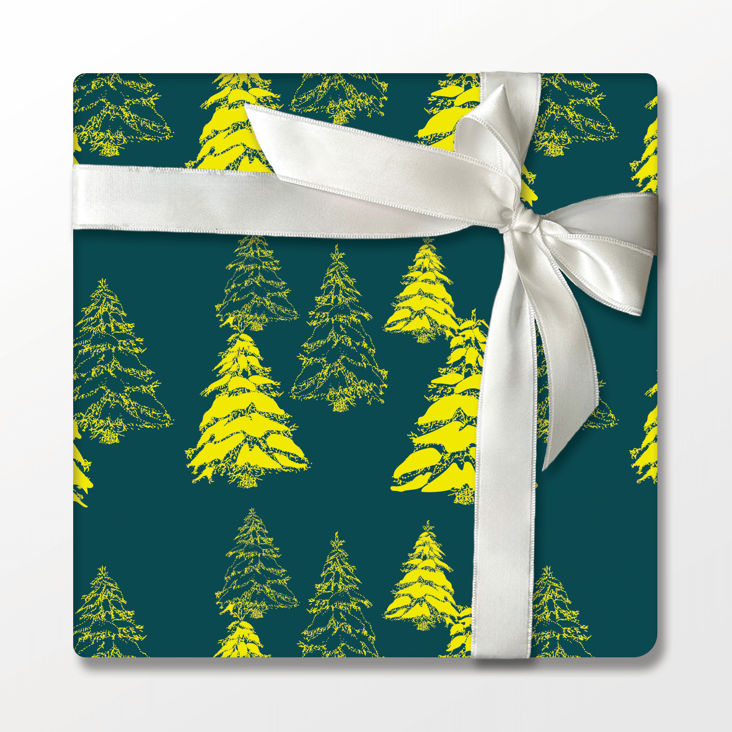 Fresh, woodsy, and full of holiday spirit, Bright Christmas Trees in Green reimagines traditional tree wrapping with vibrant color and modern flair. Chartreuse evergreens stand out against deep spruce green, while the reverse side’s bright stripe keeps things crisp and refined.