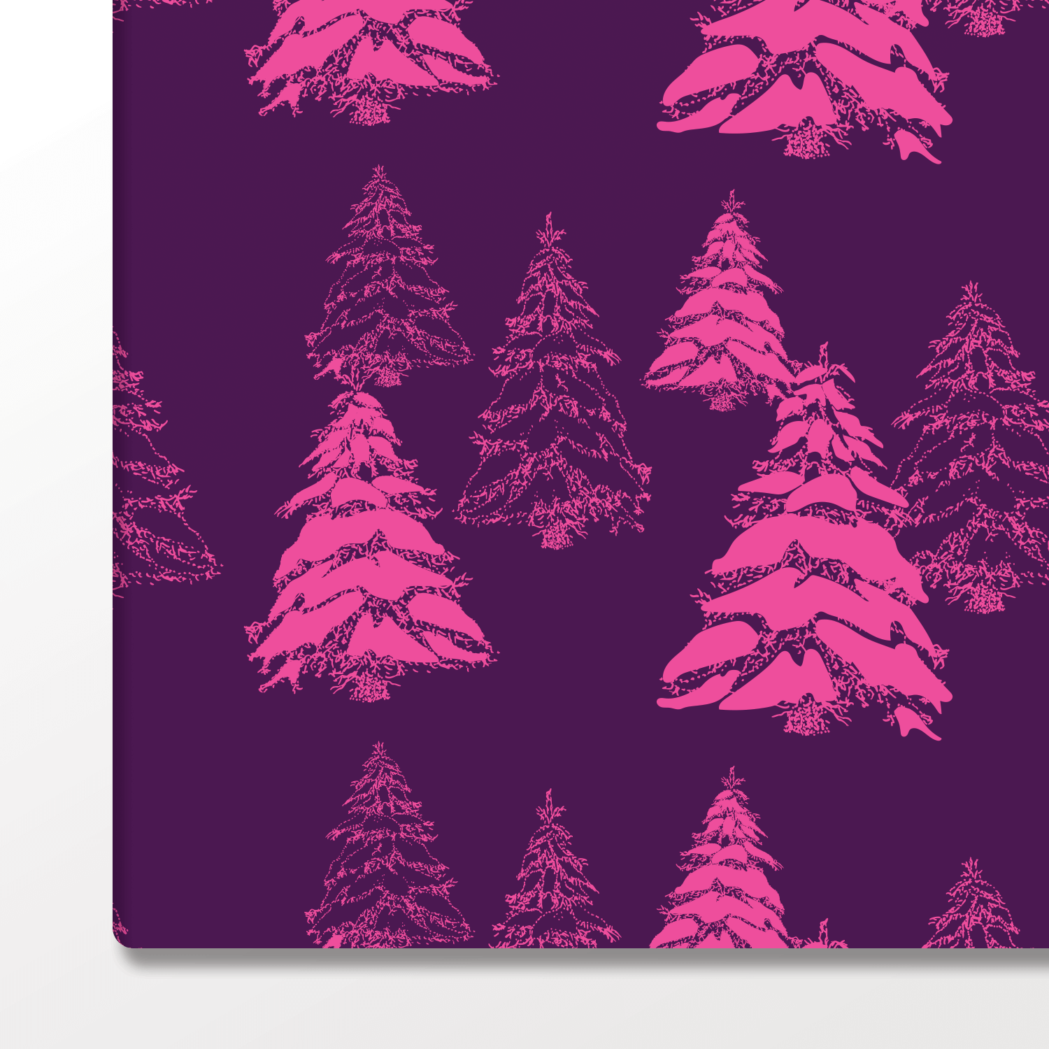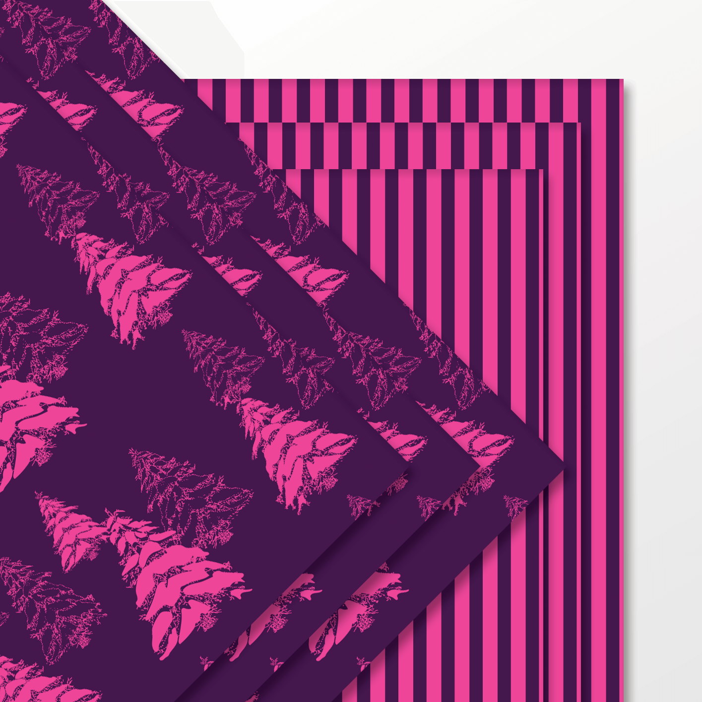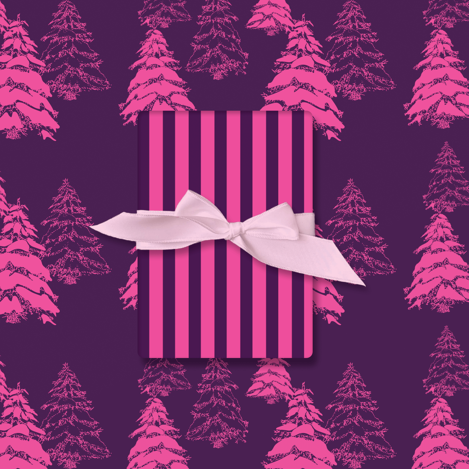 A bold twist on a classic Christmas tree print — hot pink trees on deep purple with a coordinating stripe on the reverse. Don't forget to add a set of 5 matching gift tags.