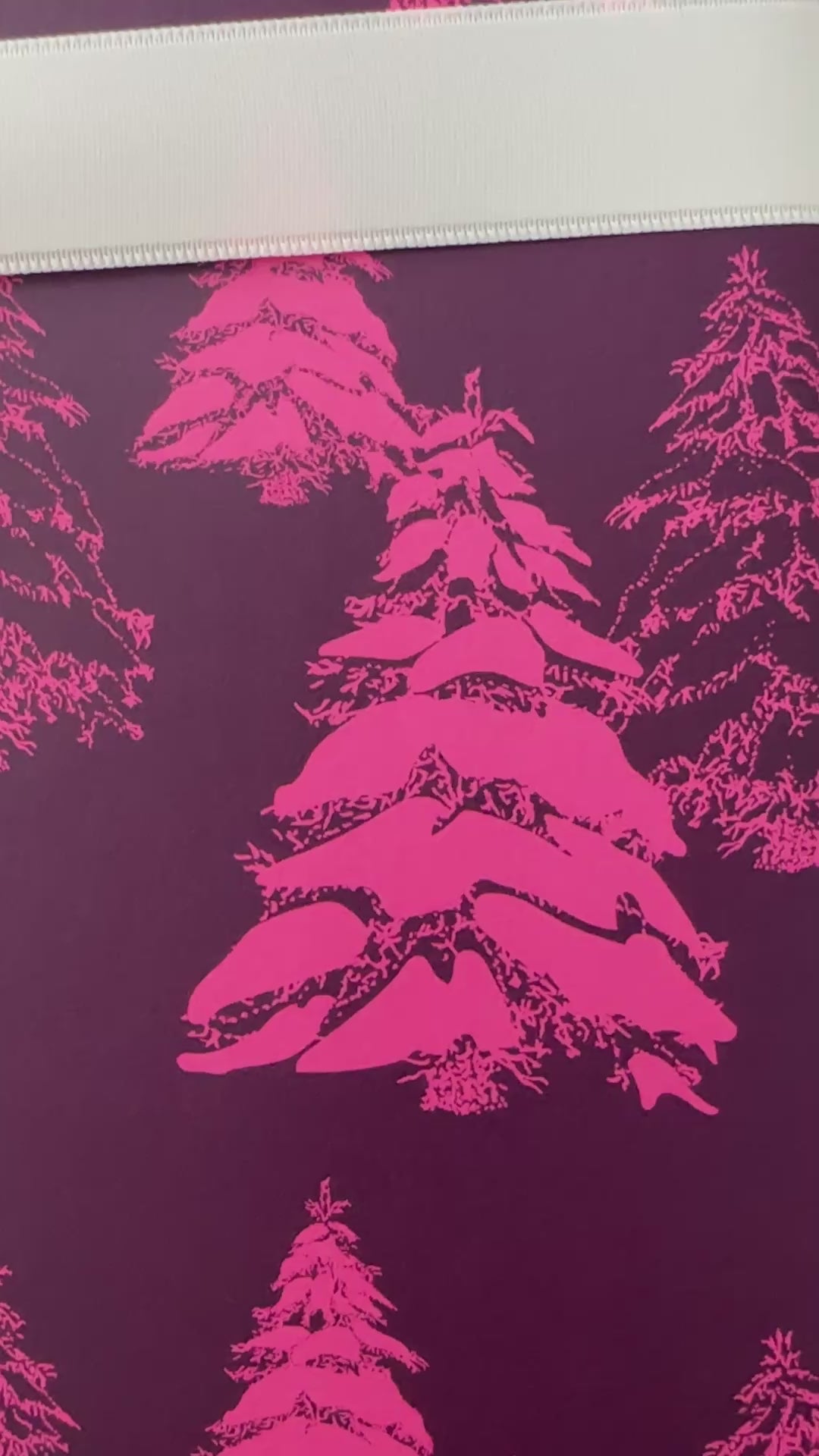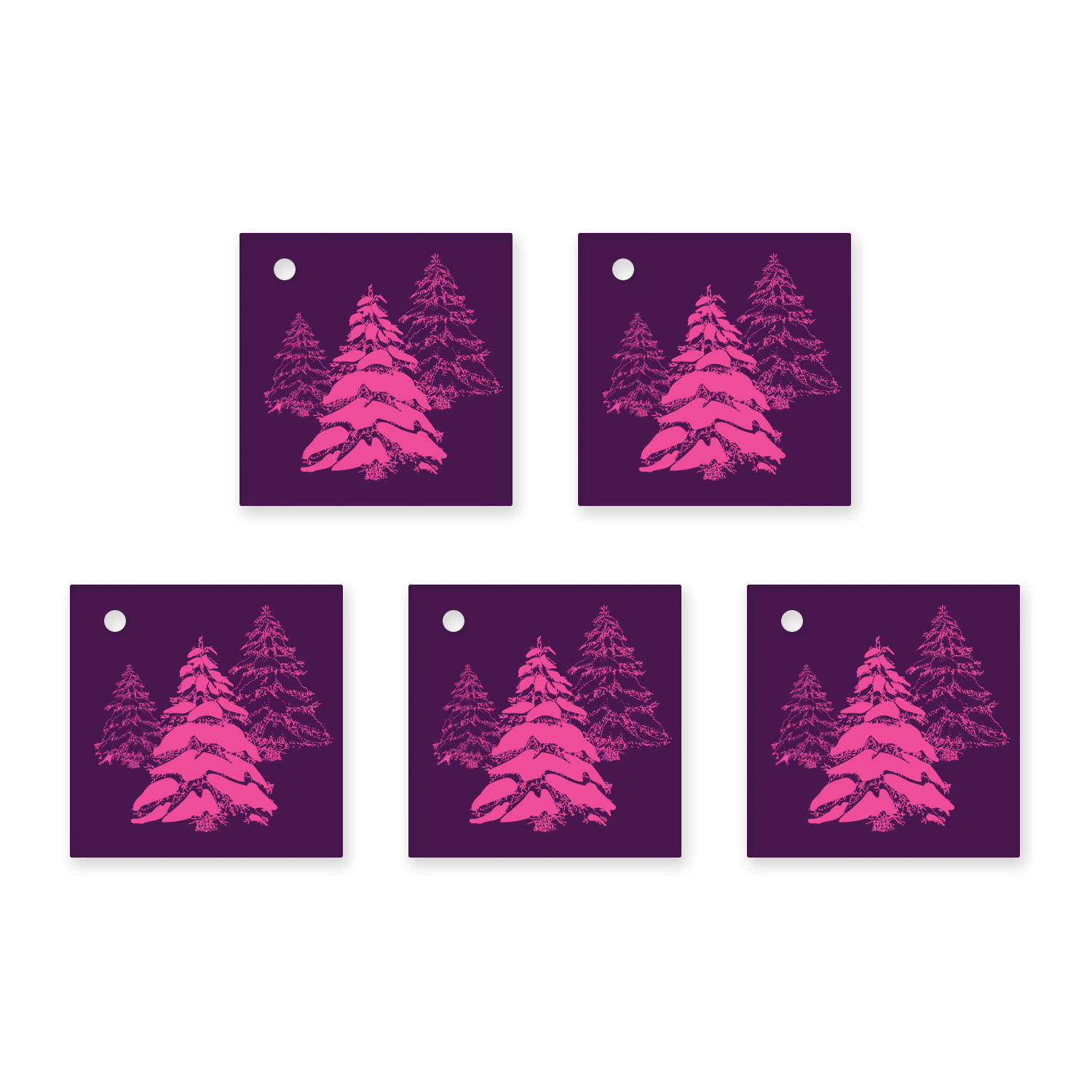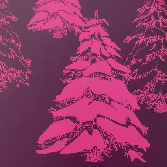 A bold twist on a classic Christmas tree print — hot pink trees on deep purple with a coordinating stripe on the reverse. Don't forget to add a set of 5 matching gift tags.
