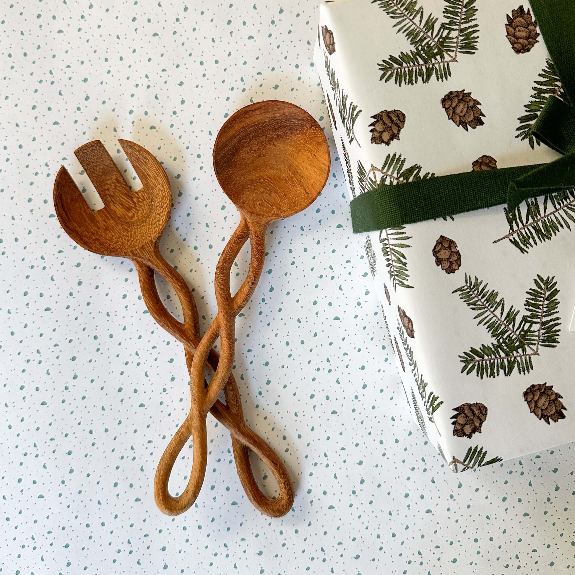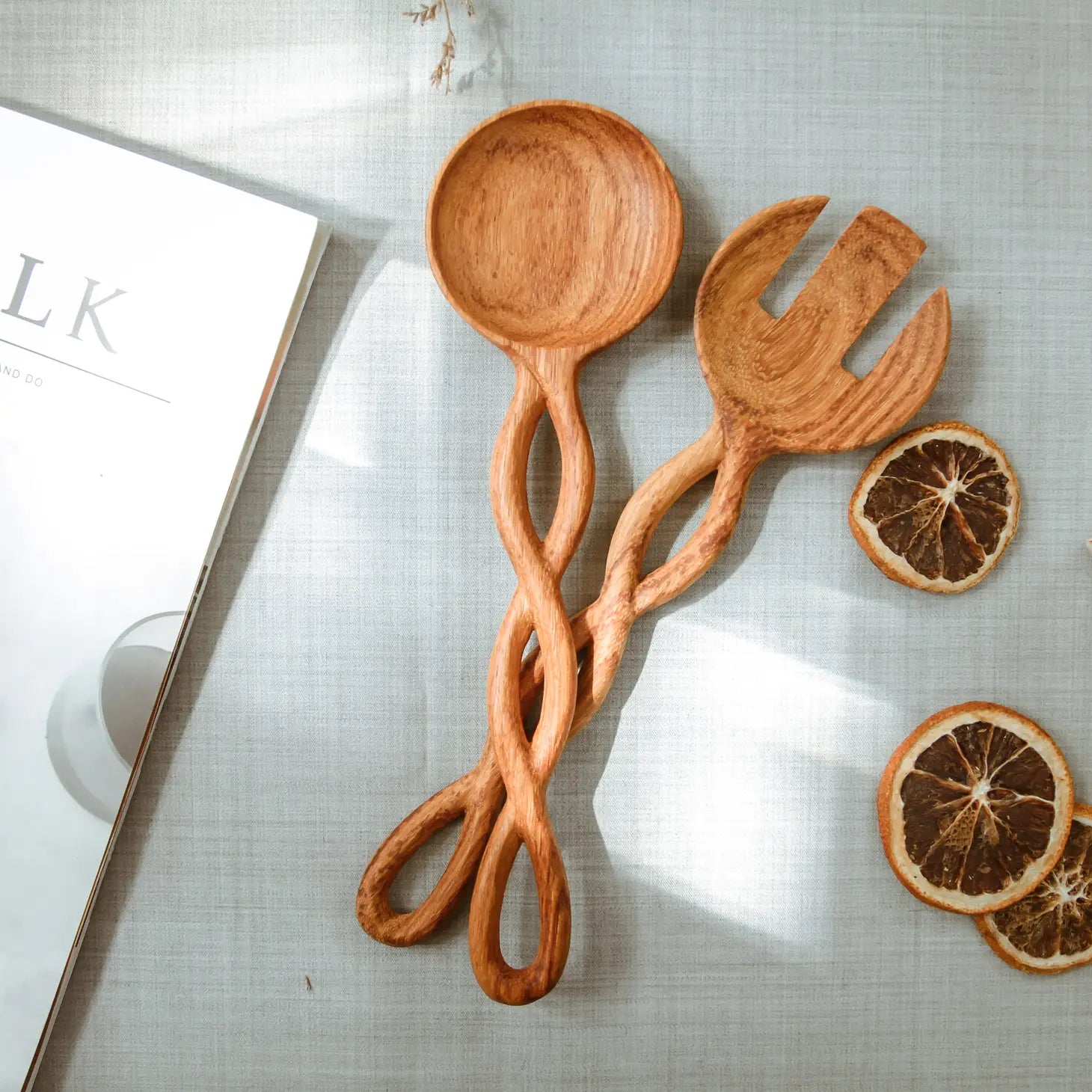 - Serving Set: Twisted handle wooden serving spoon and fork set perfect for dishing out salads and sides. They are handmade from sustainably sourced doussie wood