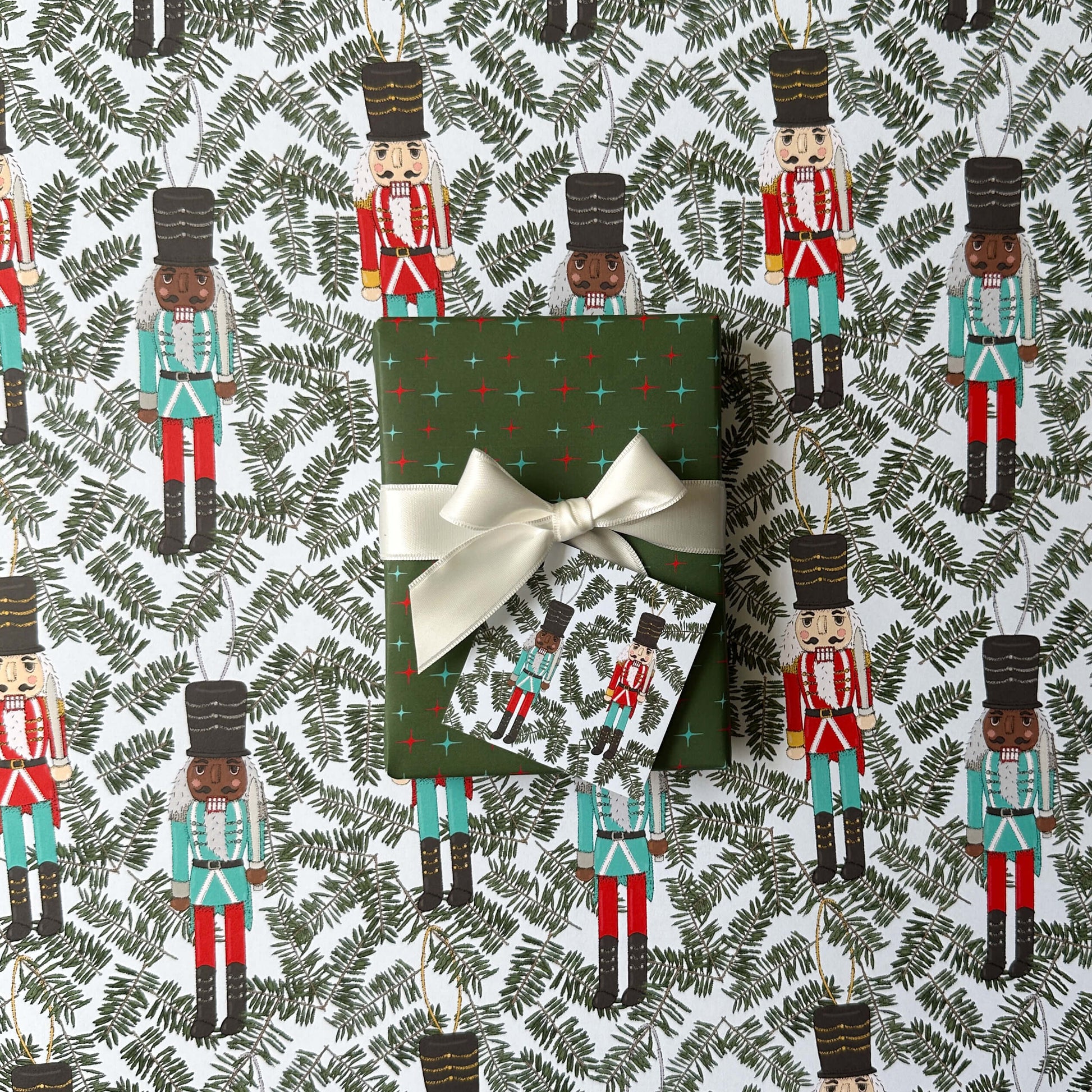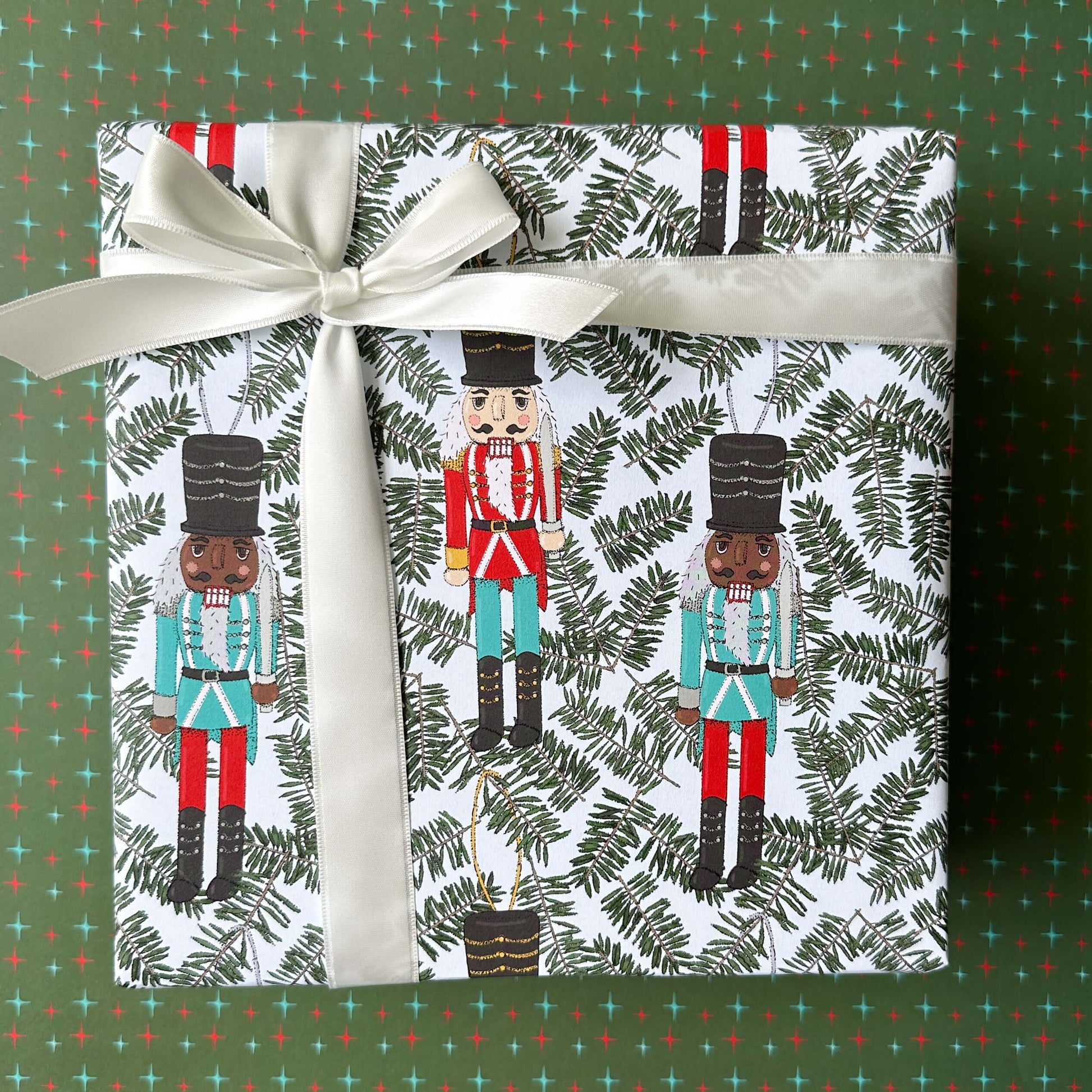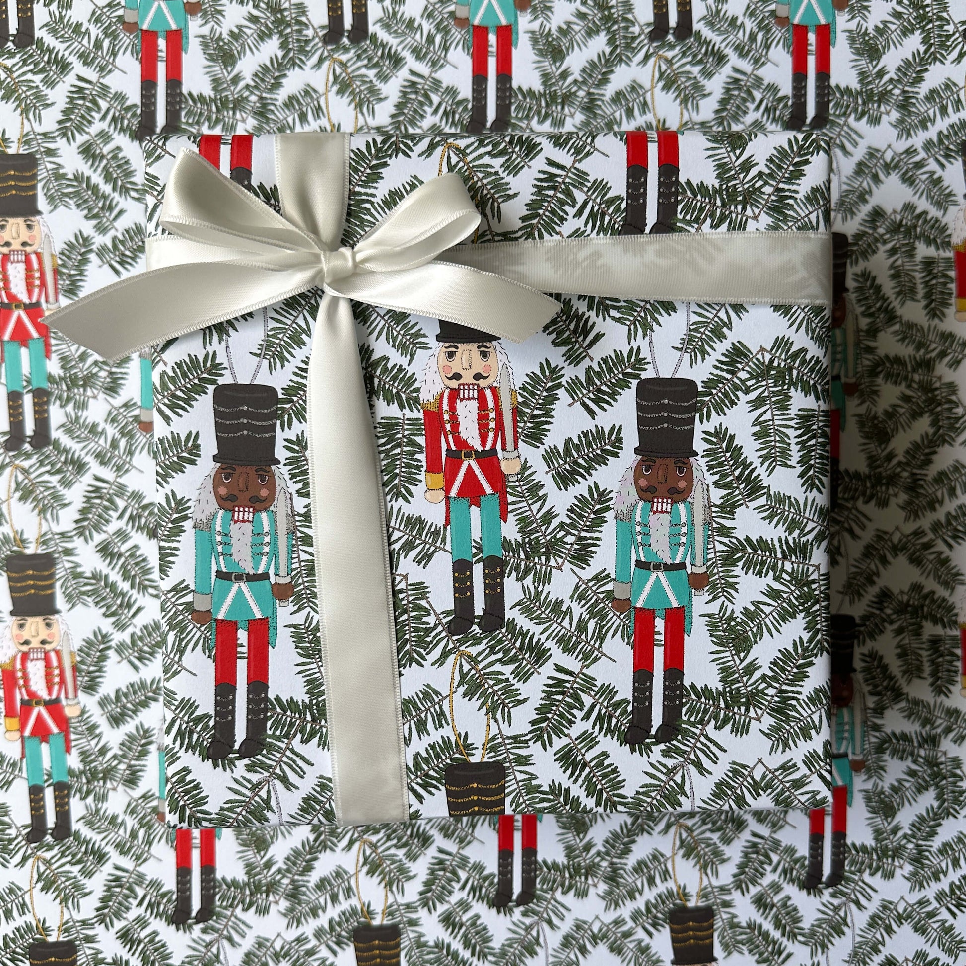Ballard & Prescott’s Nutcracker Wrapping Paper is both classic and modern. This is an inclusive design, featuring charming nutcracker ornaments with light and dark skin hanging on the boughs of a Christmas tree. This gift wrap is perfect for nutcracker collectors, fans of ballet, or boys and men.