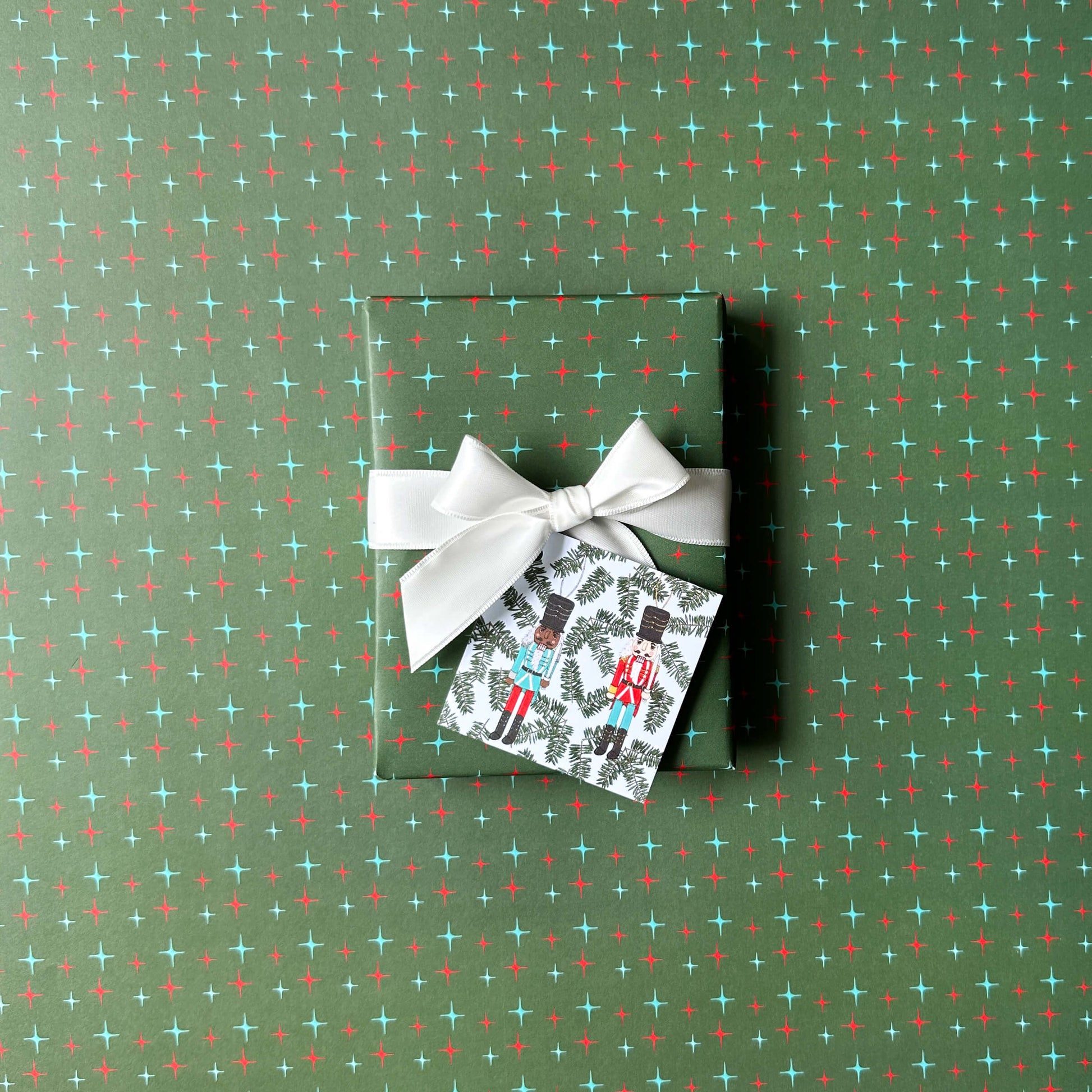 This luxury double-sided wrapping paper features Nutcracker ornaments with light and dark skin, in red and teal costumes. The opposite side features red and teal twinkles on a deep green background.