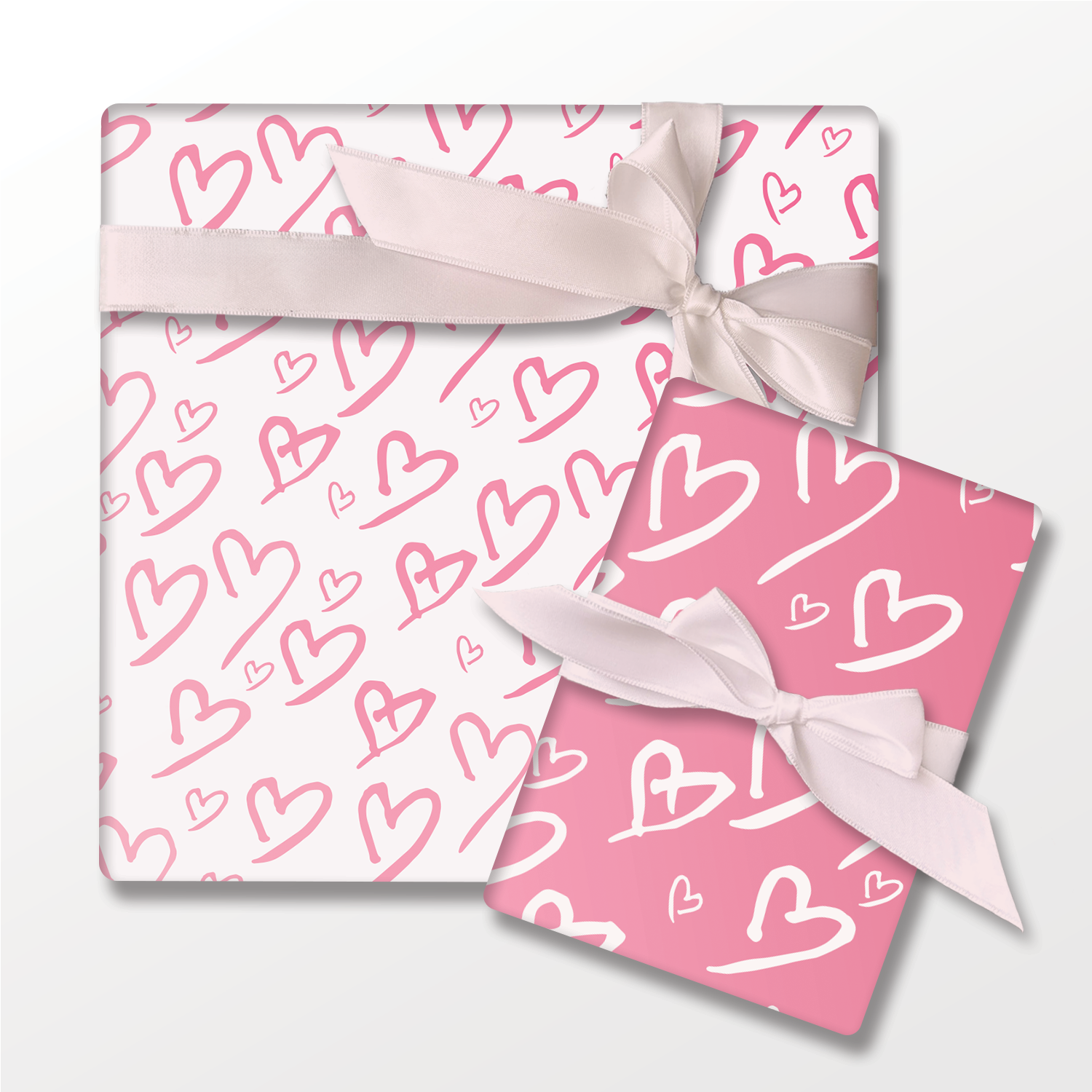 This luxury double-sided wrapping paper features white hearts on an ombre pink background. The opposite side features ombre pink hearts on a pale pink background.