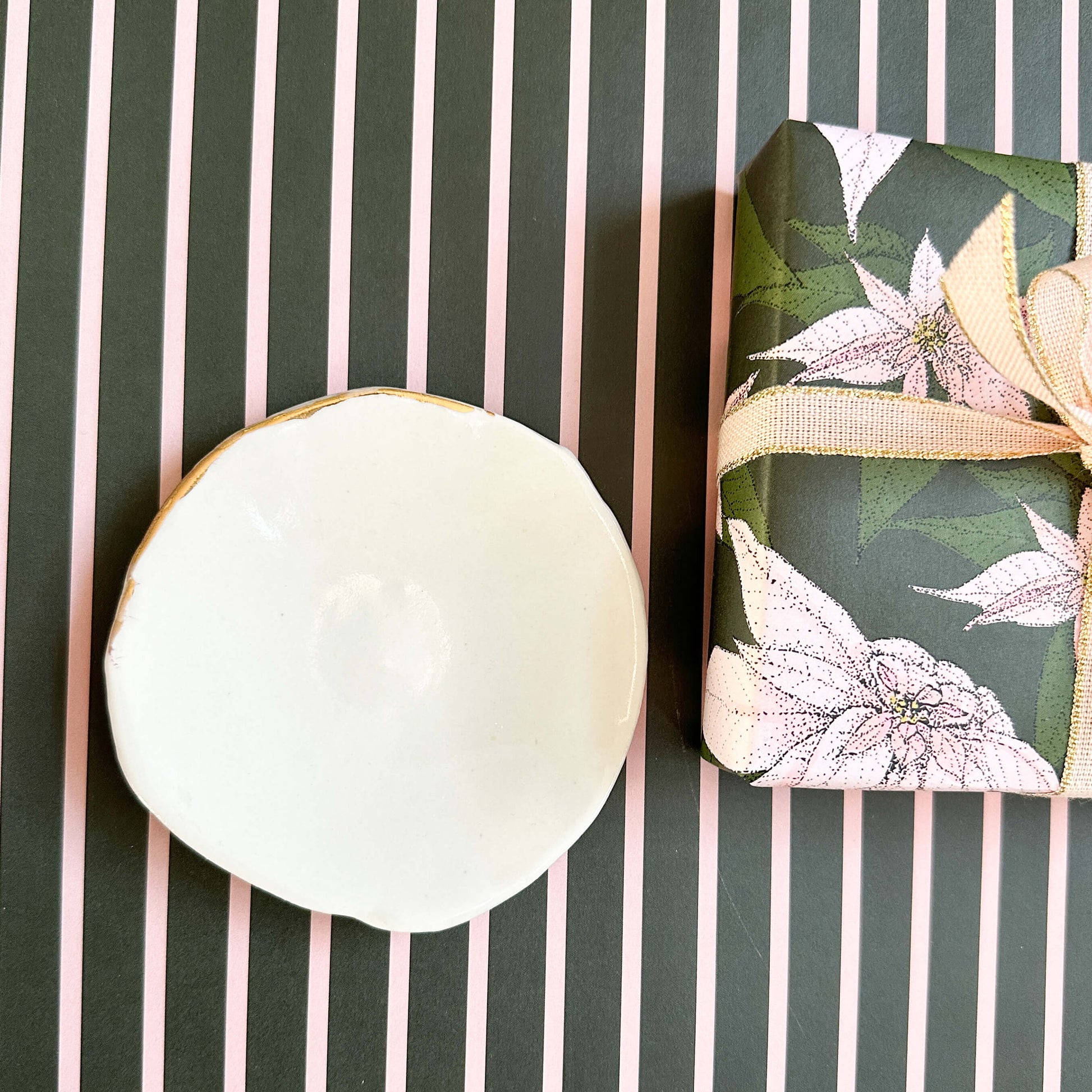 Handmade by Massachusetts artist Michelle Barrett Ceramics, this dish is approximately 3.5 inches in diameter and perfect for jewelry display, a spoon rest, or a small soap dish. These trinket dishes are formed individually by hand, covered in a glossy food-safe glaze and finished with a flourish of precious 22k gold.