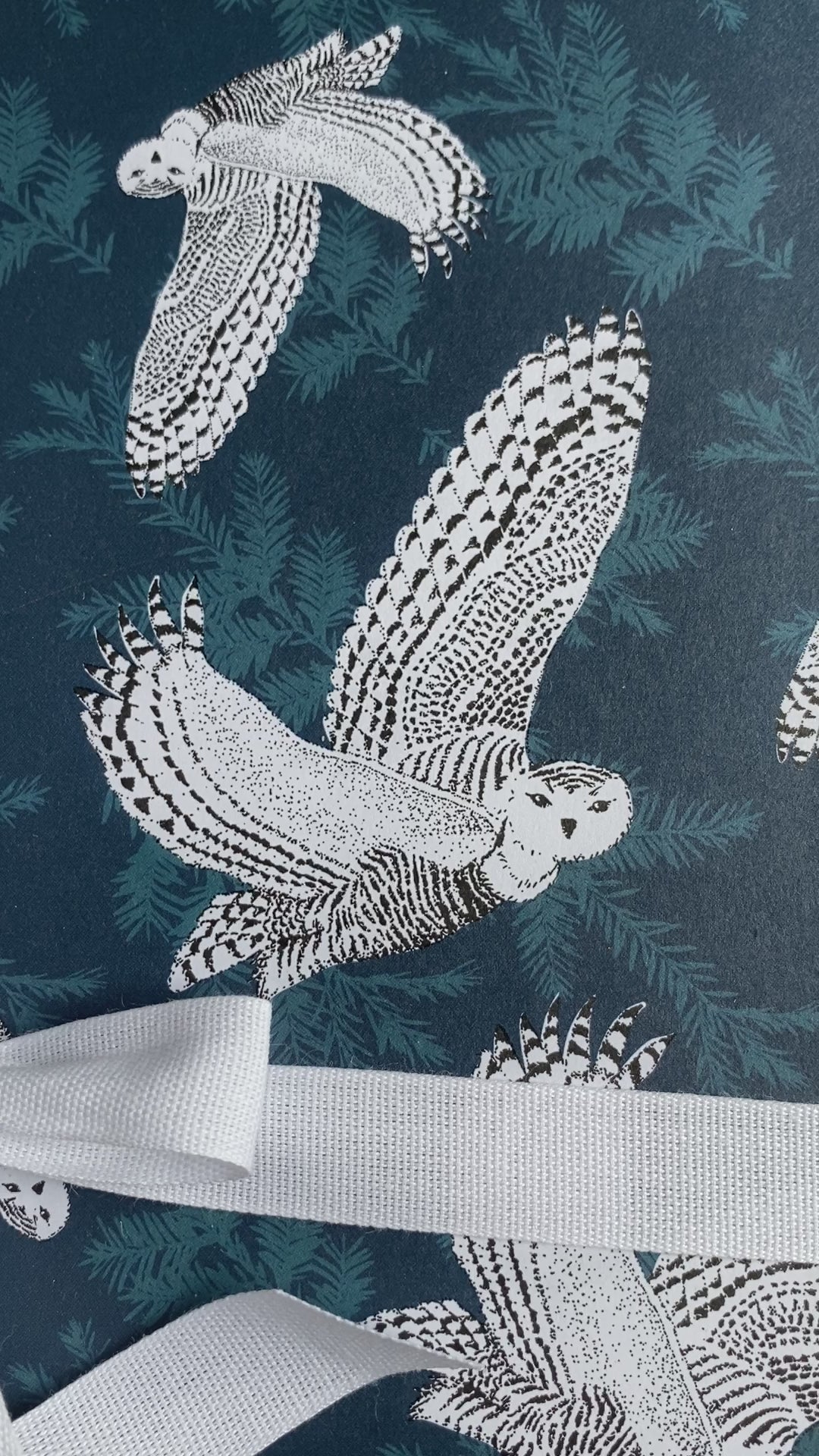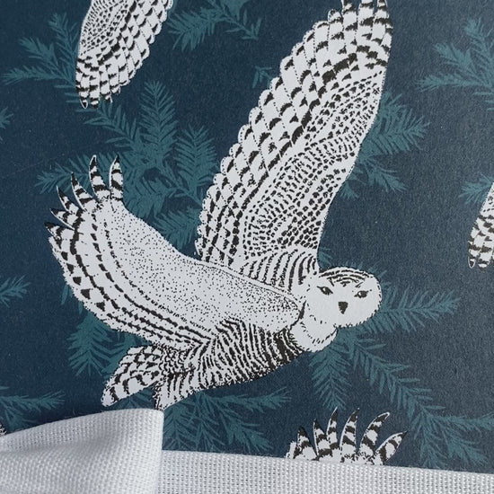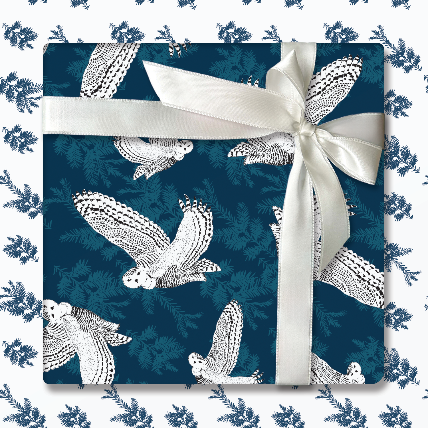 This luxury double-sided wrapping paper features snowy owls flying over a deep blue forest of hemlocks. The opposite side features a pattern of deep blue hemlock branches on a white background.